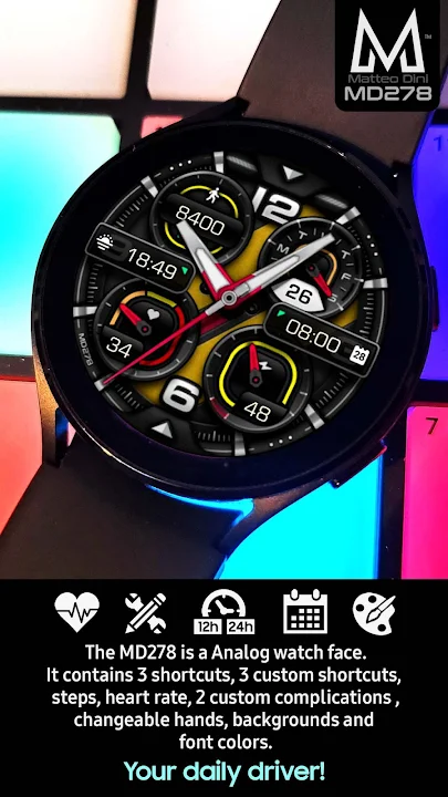 MD278 是一款由 Matteo Dini MD 设计的 Analog Wear OS 表盘。