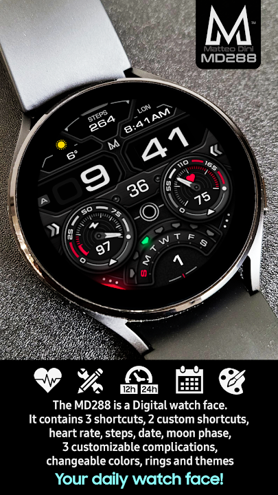 MD288 是一款由 Matteo Dini MD 设计的 Digital Wear OS 表盘。