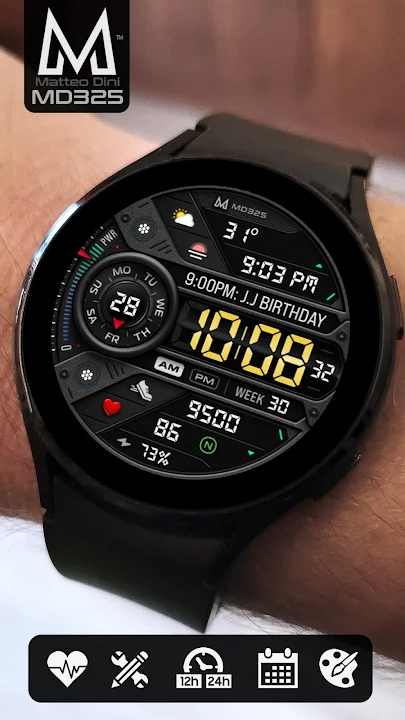 MD325 是一款支持 Wear OS 的数字表盘,具有多种自定义功能。