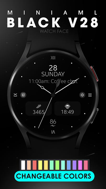 簡約的黑色經典錶盤,具有自訂快捷鍵、風格和複雜功能。