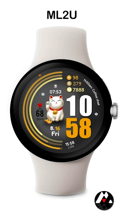 Bring a touch of good fortune to your wrist! This vibrant watch face features an iconic lucky cat, blending charm with a sleek, modern display of your essential stats.
