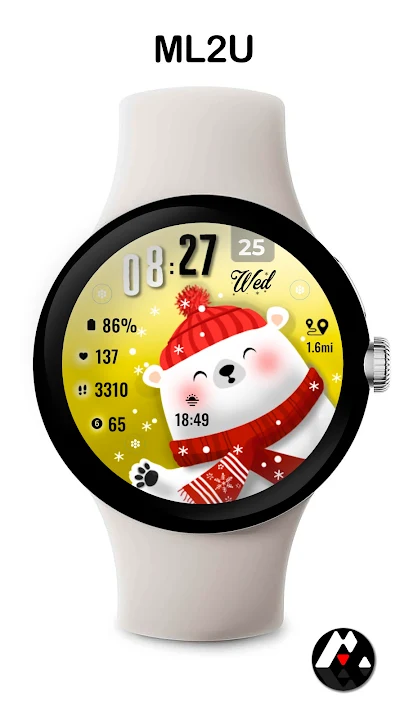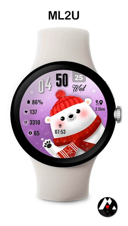 用 ML2U 163 在腕间探索冬日的魔力!这款表盘以一只温暖的北极熊为主题,依偎在轻柔飘落的雪花中。