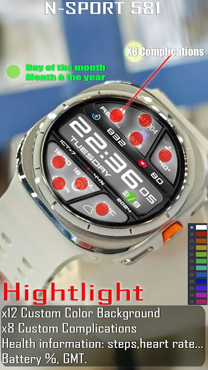 N-Sport 581 錶盤採用動感運動/奢華/經典風格設計,讓您以最直觀的方式追蹤數位時間。您可以自訂顏色背景和許多附帶的複雜選項。