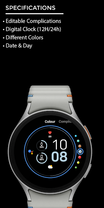 Editable Complications, Digital Clock (12h/24H), Different Colors