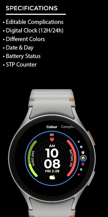 Editable Complication • Digital Clock, Date & Day, STP Counter, Different Colors