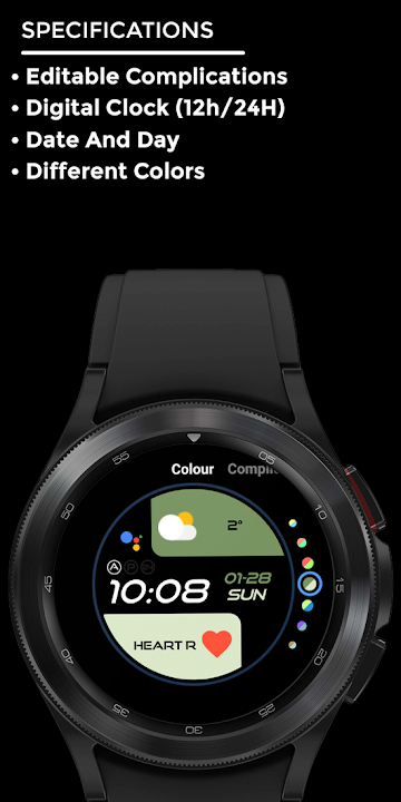 可编辑复杂功能, 数字时钟 (12 小时/24 小时), 日期和星期, 不同颜色