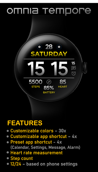 Omnia Tempore 為 Wear OS 裝置(版本 5.0)打造的便利易讀數位錶盤。它提供豐富的可自訂功能,包括 30 種顏色組合、4 個預設應用程式捷徑(設定、鬧鐘、資訊、日曆)以及 4 個可自訂的應用程式捷徑(兩個可見,兩個隱藏)。此外,它還包含心率測量和步數統計功能。 AOD 模式下,此錶盤的低功耗特性也使其脫穎而出,非常適合日常使用。