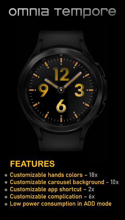 乍一看,這是一款專為 Wear OS 裝置(5.0 版)設計的簡潔明了的類比錶盤。然而,它擁有眾多可自訂的複雜功能(6 個)和應用程式快捷鍵插槽(2 個),為使用者提供了豐富的選項,可根據自己的需求或喜好調整錶盤的外觀。此外,它還提供了多種指針顏色變化(18 種)和 10 種可選的動畫旋轉背景。這些設定可以根據需要進行組合,讓使用者能夠根據自己的喜好組合錶盤的外觀。此外,還提供節能的 AOD 模式以及 Omnia Tempore 的另一款便利時尚的錶盤…