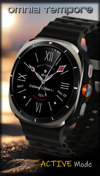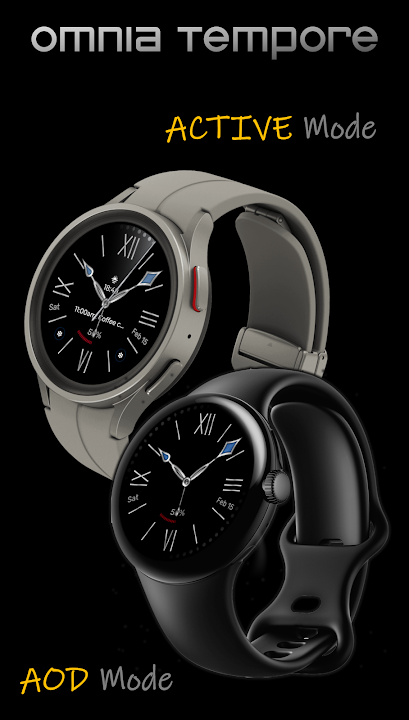 Omnia Tempore 專為 Wear OS 裝置(版本 5.0 及以上)打造的便利、設計清晰的類比錶盤,配備可自訂的應用程式捷徑插槽(2 個可見,2 個隱藏)、一個預設的應用程式快捷方式(日曆)以及兩個可自訂的複雜功能。該錶盤還提供 18 種指針顏色組合。