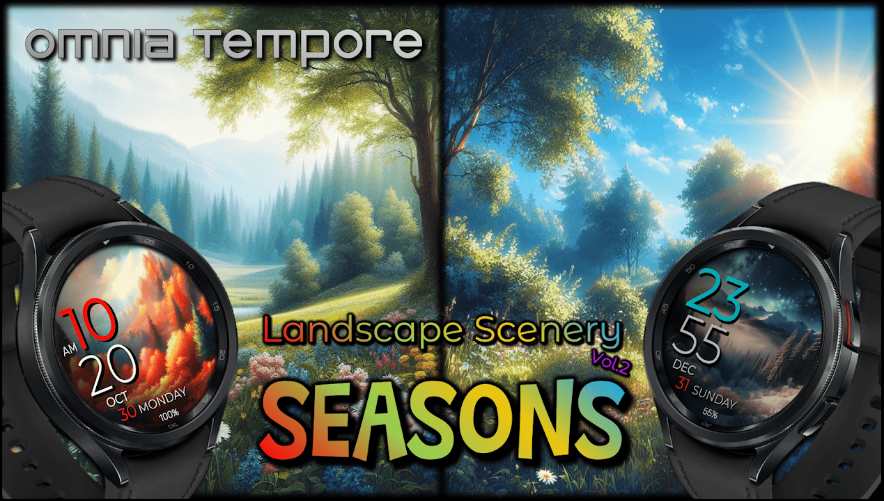 The seasons-themed digital watch face from Omnia Tempore for Wear OS devices (version 5.0+). It offers a choice of 8 seasons-themed backgrounds and 7 customizable color variations for the numerals. One app shortcut (Calendar) and several hidden customizable app shortcut slots (4x) are also included. The watch face is ideal for nature lovers. It stands out for its extremely low energy consumption in AOD mode.