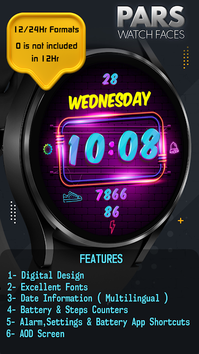 Pars Neon 數位錶盤專為 WearOs 裝置設計,與 Wearos Api 34+ 裝置相容。