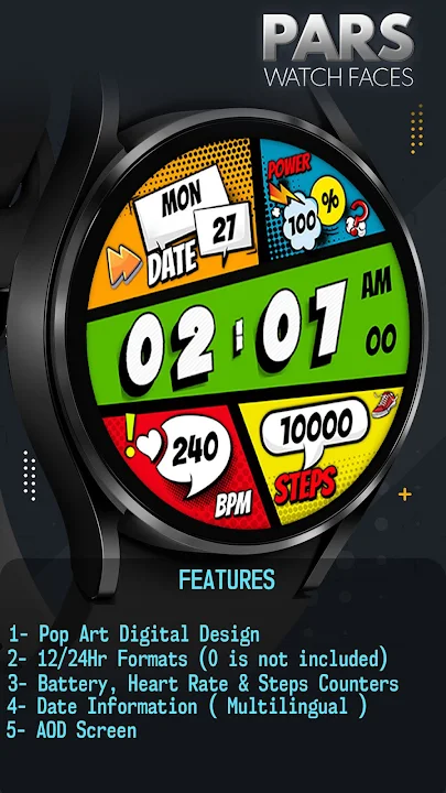 Pars Pop Art Joy 表盘专为 WearOs 设备设计,与 Wearos Api 34+ 设备兼容。