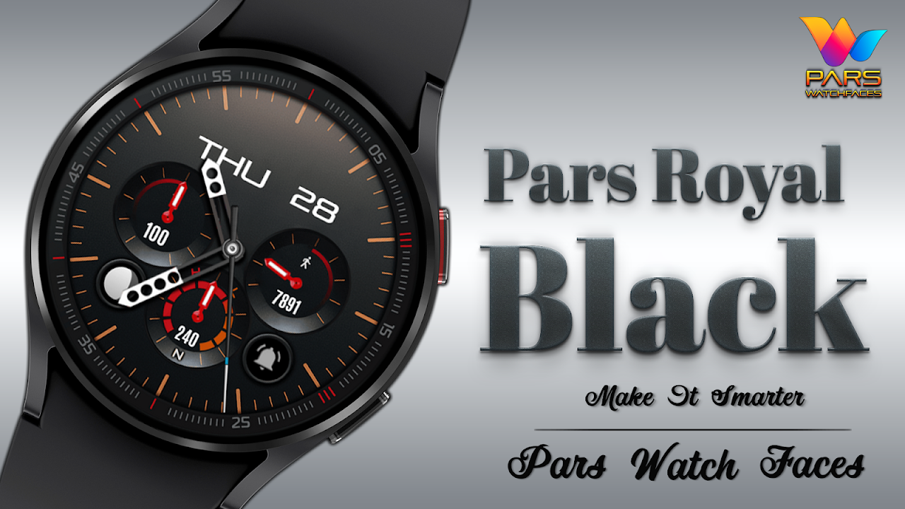 Pars Royal Black is a simple, clean and informative analog watch face. Pars Royal Black is compatible with all watches using Wear OS SDK 34 and Api 34+.