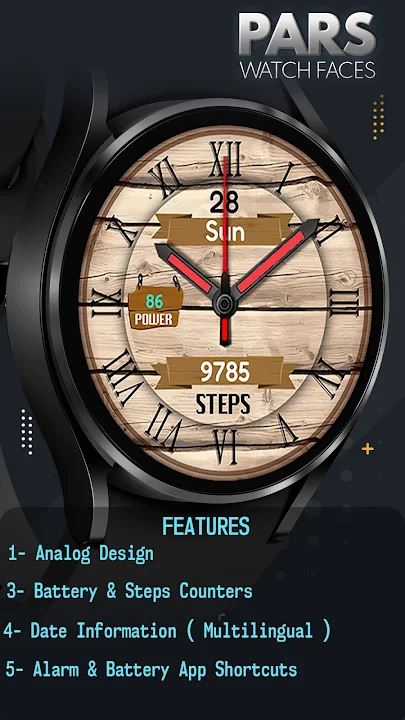 Pars 木製類比錶盤專為 Wear Os 裝置設計,與 Wear Os Api 34+ 裝置相容。