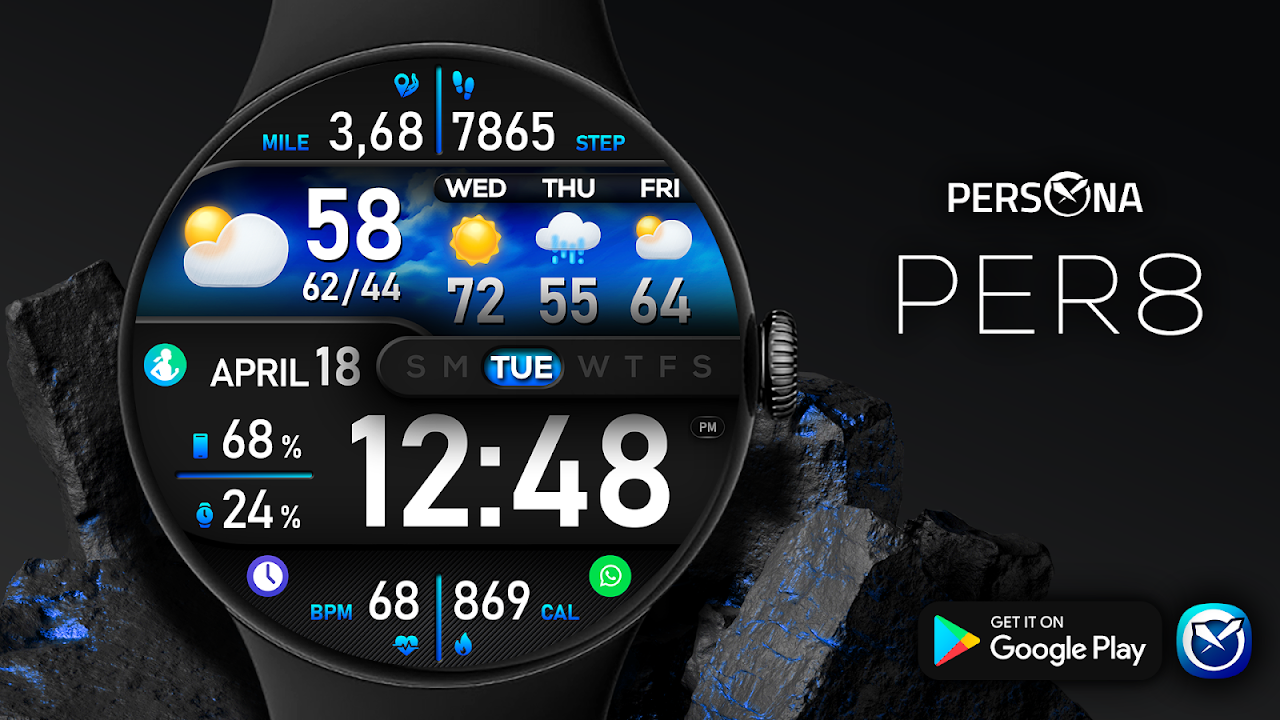 🚀 PER8 天气表盘数字版是一款专为 Wear OS 智能手表设计的先进数字表盘,提供可变字体样式、动态昼夜视觉效果、惊艳视觉效果以及天气预报数据。