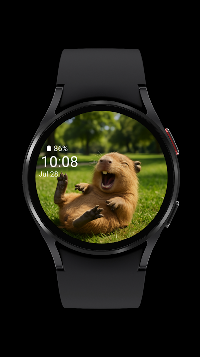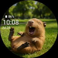 款有趣且轻松的表盘,展示了躺在草地上微笑的水豚。显示时间、日期和电池电量。