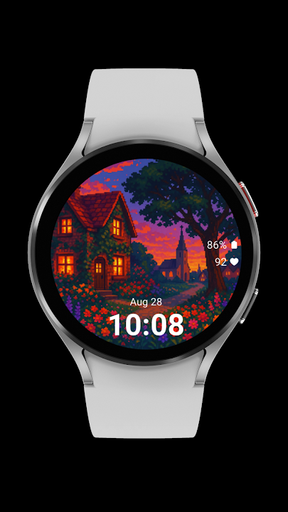 A magical sunset in a charming village brings this face to life, with a cozy brick house, colorful flowers, and a church in the background. The display shows date, time, battery level, and heart rate clearly and elegantly—perfect for those who love warm and colorful scenes.
