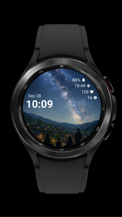 展示星空下村庄的设计。显示时间、日期、电量、步数、心率和通知。复杂功能可自定义,并可替换为其他信息。