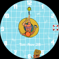 At the center of the watch face is a whimsical scene featuring a floating guy on a floater girl standing in a sparkling swimming pool. As time passes, you'll notice the floating guy's leg indicating the hours, while a rotating duck gracefully glides around the watch face to represent the minutes. And to add an extra touch of charm, a lively life buoy acts as a seconds indicator, spinning cheerfully with each passing second.