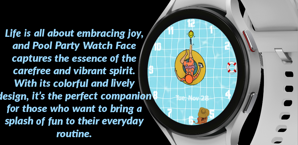 So, take a dip into the Pool Party Watch Face and let the vibrant scene on your wrist transport you to a sunny pool party filled with laughter and excitement. Get ready to make a splash and enjoy the playful moments while keeping track of time in style."