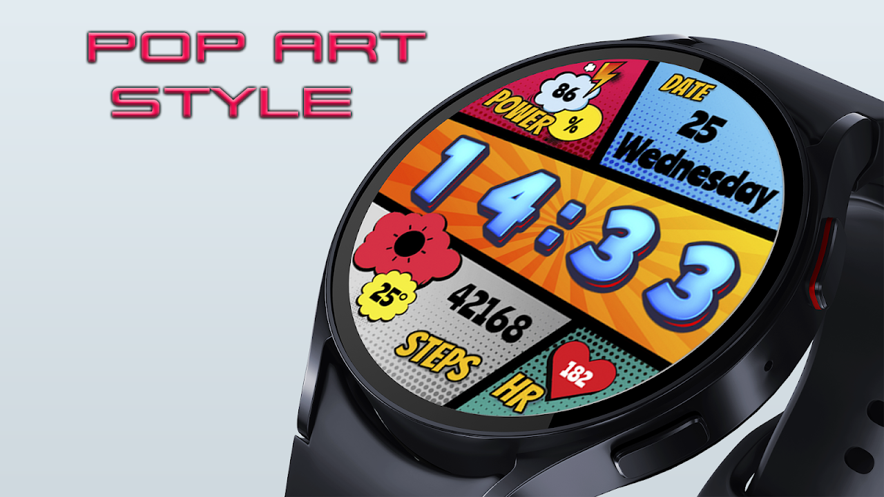 Turn your wrist into a canvas of color with Pop Art – the smartwatch face that blends bold pop art design with real-time health and weather insights.