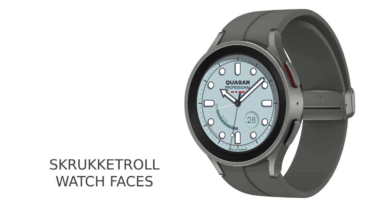 Quasar Professional 是一款精致的潜水风格表盘,将坚固耐用与优雅简约融为一体。它具有醒目的小时标记、柔和的蓝色表盘和谨慎的电池指示器,提供优质的功能体验。 Quasar Professional 在挪威自豪地设计,以其简洁的布局和微妙的挪威国旗细节体现了精确性和清晰度。非常适合那些欣赏 Wear OS 智能手表上精致而实用的腕表的人士。
