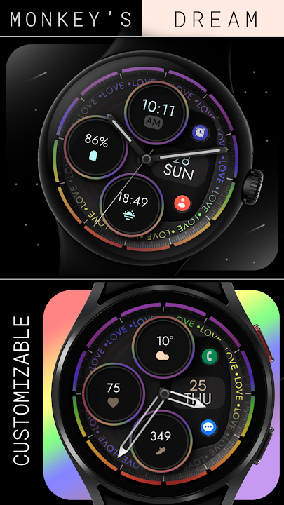 用这款适用于 Wear OS 智能手表的时尚彩虹混合表盘拥抱爱。这款表盘采用深色背景和色彩缤纷的点缀,表盘上优雅地重复出现“LOVE”一词,为您的智能手表增添了充满活力且有意义的触感。