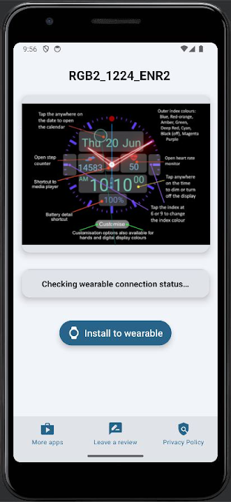 This is a dual-display watch face for Wear OS showing both digital and analogue time with slightly neon-effect hands. The digital display shows the day, date, month, and time. The digital time 12H/24H format follows the phone that the watch is paired to - use the Date/Time setting in your phone settings to change. Also included are heart rate, step, and battery indicators. These are fixed and non-configurable (this may change in the future). Tapping different parts of the display will either open the relevant apps or change the appearance. The digital portion of the display can be dimmed or turned off completely. Red AOD display is designed to be non-intrusive for night time/car use but still readable during normal use. There is a hidden shortcut to the media player in the centre