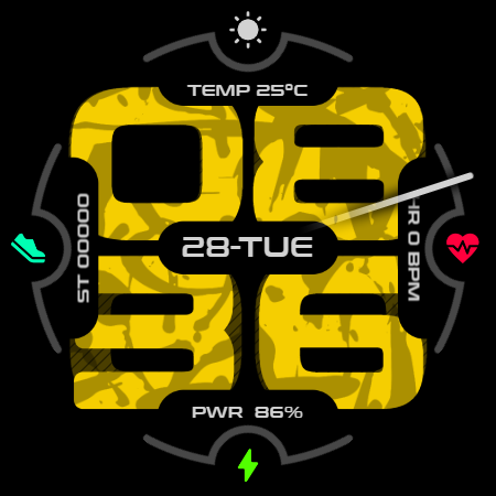 This Wear OS watch face has everything you need - digital time, date, battery level, heart rate, step count and lots of color options.