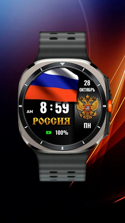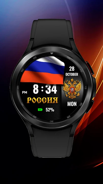 - 俄羅斯三色旗的動畫顯示,帶有逼真的波浪和陰影,部分覆蓋時間。但不用擔心,錶盤的可讀性不會受到任何影響。