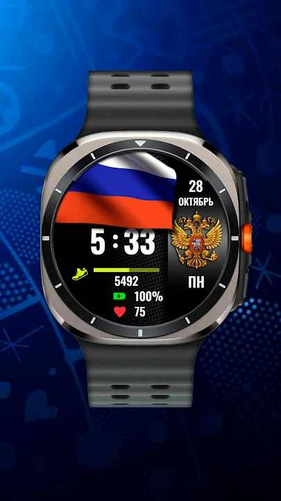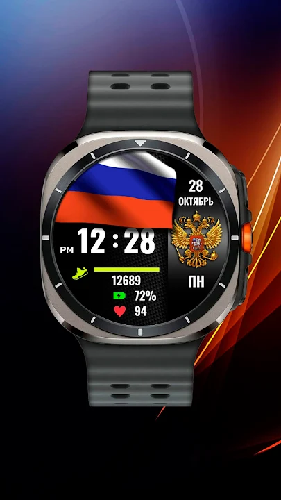 - Animated display of the Russian tricolor with realistic swaying and a shadow, partially covering the time. But don't worry, the readability of the dial has not suffered from this in any way