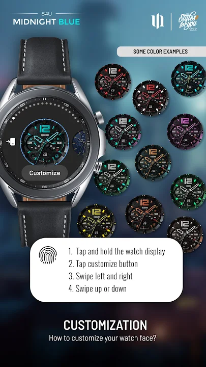 Enhance your Wear OS experience with the S4U Midnight Blue. A realistic classic analog watch face with multiple customization options, different color variations and editable complications.