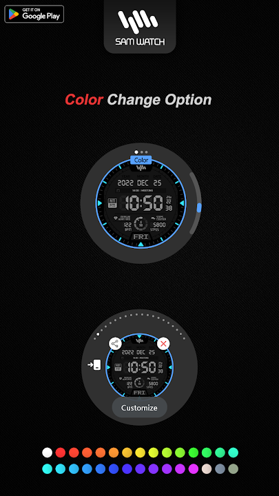 *The smartphone app is an additional app in the Watchface app that explains the download guide. It may be different from the watchface screenshot of the smartphone app and the watchface screenshot that actually downloaded. Most of SamWatch's Watchface app products include apps for smartphones.