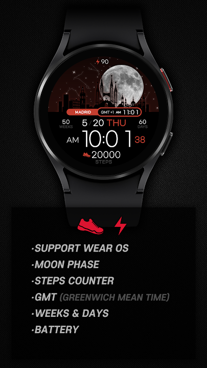 *智能手機應用程序是 Watchface 應用程序中的附加應用程序,用於解釋下載指南。它可能與智能手機應用程序的錶盤截圖和實際下載的錶盤截圖不同。 SamWatch 的大多數 Watchface 應用程序產品都包含適用於智能手機的應用程序。