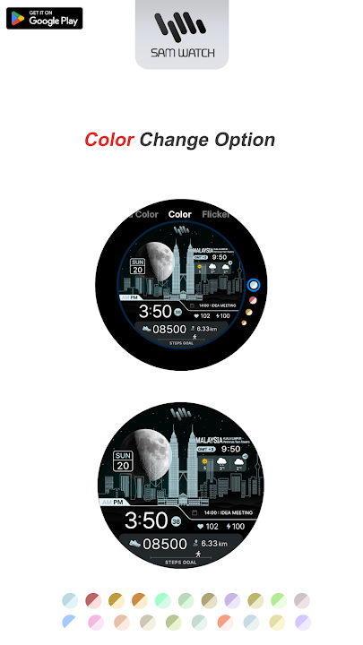 *“SamWatch 安装指南”应用程序是支持在 Wear OS 设备上下载应用程序的附加应用程序。它可能与“SamWatch 安装指南”应用程序的表盘屏幕截图和实际下载的表盘屏幕截图不同。 SamWatch 的大部分表盘应用程序产品都包含智能手机应用程序。 “SamWatch 安装指南”的应用程序仅帮助您下载 Wear OS 应用程序。
