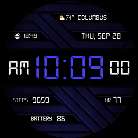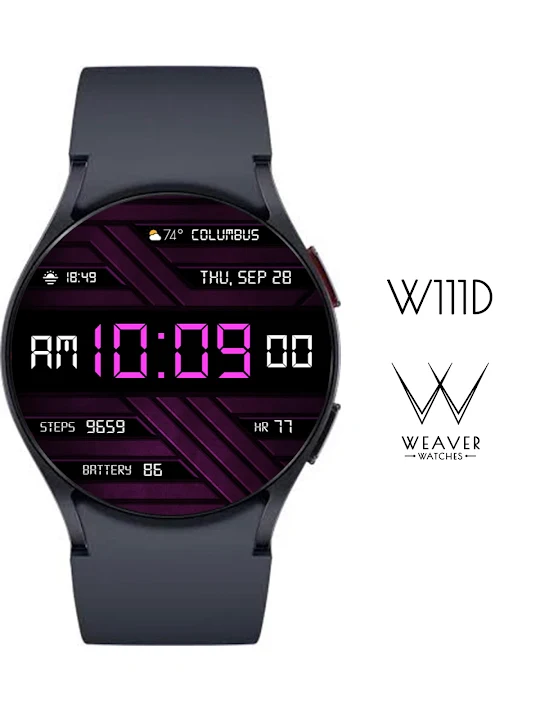 W111D 包含 2 个可定制的快捷方式,专为日出/日落和天气复杂情况而设计,以及电池、步数和心率显示。多种颜色主题可供选择。