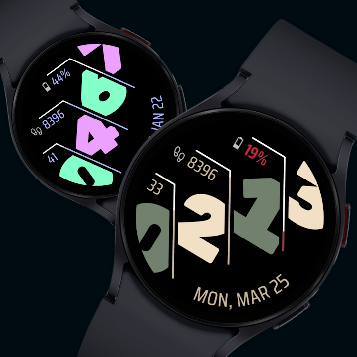 Slic/ed 具有四个大型切片数字,以引人注目的方式显示时间。三个条作为进度指示器,显示秒数、步数和电池电量。还有一个圆形日期显示。时间可以以 12 或 24 小时格式显示。最重要的是,Slic/ed 有十种时尚的颜色组合可供选择。