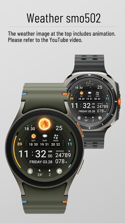 If the weather image appears as “?” after installation, please apply a different watch face and then apply it again with smo502. (If the weather image appears as "?", try applying a different watch face and then reapply SMO502.)