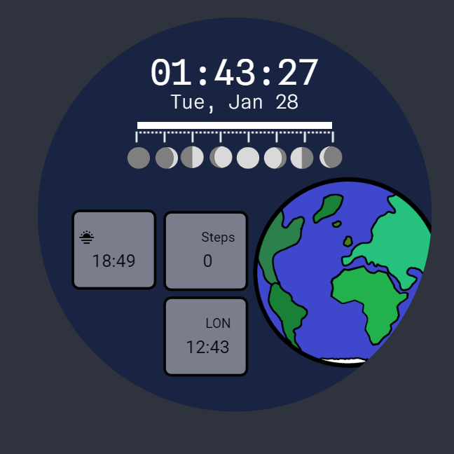 这款复杂的 Wear OS 表盘在时间下方显示地球和月相。它有 3 个可定制的编辑,并在后台启动。