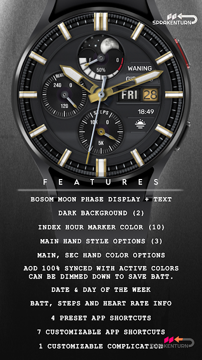 適用於 Wear OS 4 版(API 33+)或更高版本的 Wear OS 手錶的錶盤。例如三星 Galaxy Watch 5、6、7、8、Pixel Watch 2 等。此錶盤使用 Watch Face Studio 工具設計。