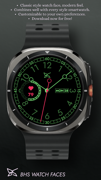 This is a classic watch face with a distinctive style reminiscent of mechanical analog watches. The black background enhances readability an adds a modern feel. The watch face comes with options to customize it to your own preferences and make it uniquely yours.