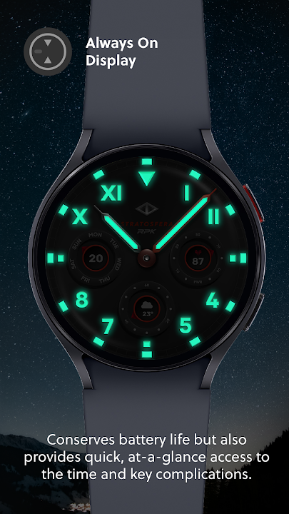 Upgrade your Wear OS smartwatch today with the Stratosfera Analog Watch Face by Active Design and enjoy a perfect fusion of style and functionality.