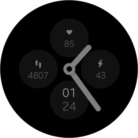 Superior 是一款适用于 Wear OS 的优雅混合表盘。顶部是心率,右侧是电池(还有百分比栏),底部是时间,左侧是步数(还有目标栏)。始终显示模式显示所有复杂情况。