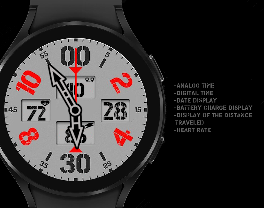 -模擬時間-日期顯示- 電池電量顯示- 顯示行駛距離-心率僅適用於 Wear 作業系統。