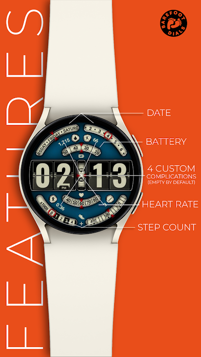 This watch face brings back the nostalgic charm of a flip clock display for the time, set against a rich, dark colored background. It integrates modern smartwatch features within curved, segmented displays. Keep track of the day of the week and the date in arcs at the top. Monitor your battery level, heart rate, and step count with dedicated meters arranged around the dial, blending vintage aesthetics with contemporary functionality.