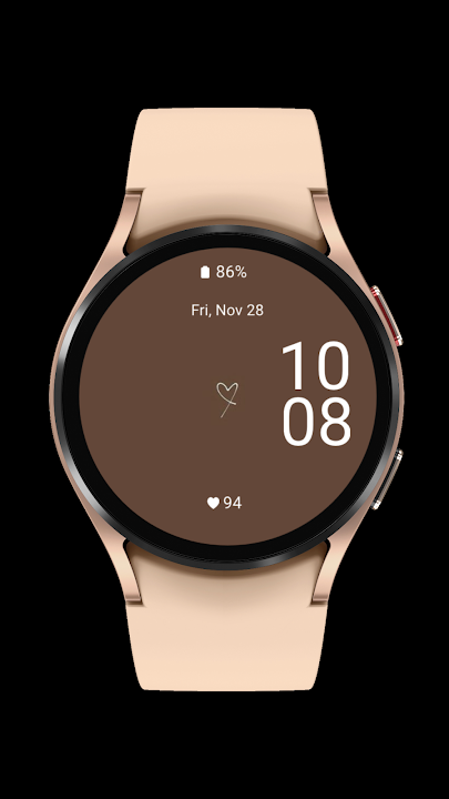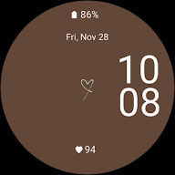 优雅的极简设计,带有心形符号。显示时间、日期、电量和心率。所有复杂功能均可自定义。