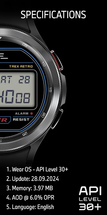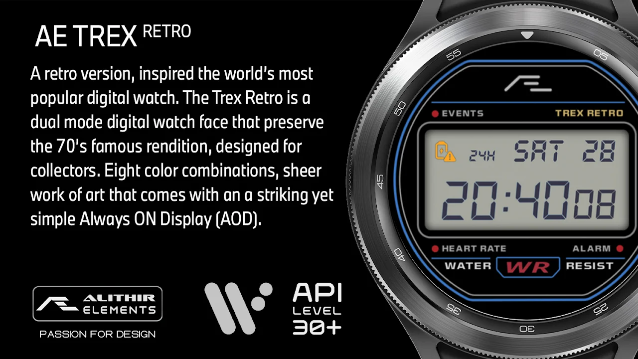 A retro version, inspired the world’s most popular digital watch. The Trex Retro is a dual mode digital watch face that preserve the 70’s famous rendition, designed for collectors. Basic health and activity watch face that serves as a formal wear. Key activity complications integrated in a secondary dial. Eight color combinations, sheer work of art that comes with an a striking yet simple Always ON Display (AOD).