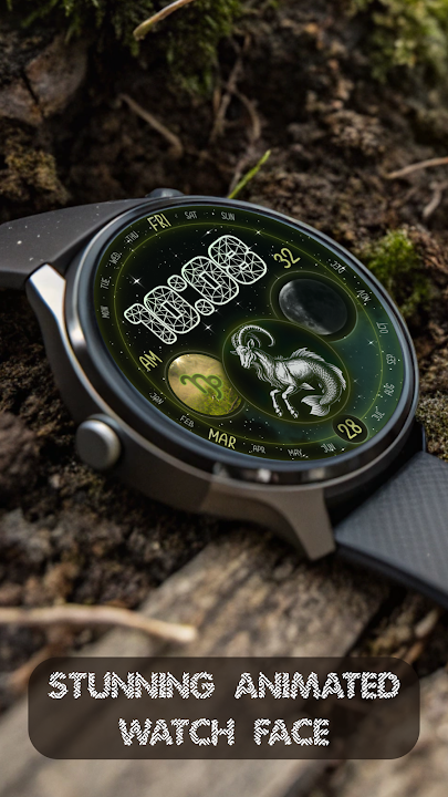 Experience the grounded energy of the Goat with CAPRICORN. This astronomical watch face combines a rugged mountain landscape animation with a clean digital time display. Designed for those who value discipline and ambition.