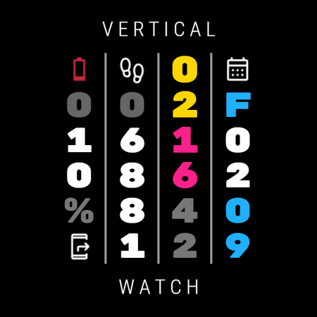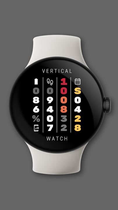 这款简约的数字表盘以四个易于阅读的垂直行显示时间(12/24 小时)、日期、电池电量和步数。选择不同的颜色组合,让您的 Wear OS 表盘与您的个人风格相匹配。