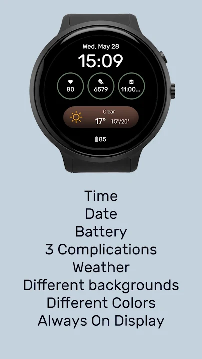 A vibrant, elegant watch face with essential info at a glance. Choose from different backgrounds and color themes. Perfect for daily use with weather, battery and health data.